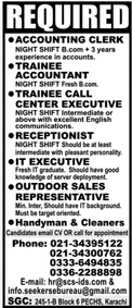 Search Computer System Internet Development System SCS-IDS is currently looking for highly qualified and experienced individuals for the positions of Accounting Clerk, Trainee Accountant, Trainee Call Center Executive, Receptionist, IT Executive, Outdoor Sales Representative, Handyman and Cleaners in Karachi.