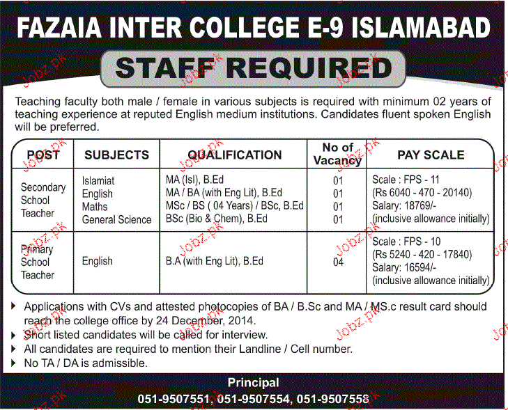 Secondary Teachers And Primary Teachers Job In Fazaia Colleg