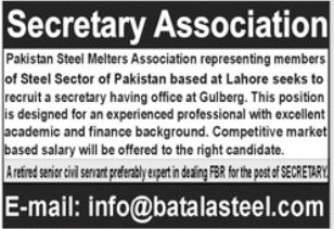 Pakistan Steel Melters Association Lahore, lahore Punjab Pakistan invites applications from eligible candidates for the post of secretary association as per advertisement of April 24, 2022 published in daily Jang Newspaper. Persons with Master and Bachelor etc. education can apply.
