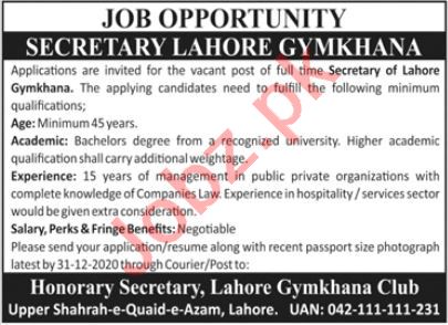 Secretary Jobs 2020 In Lahore Gymkhana Club