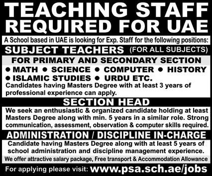 Vacancies in Pakistani School Ajman PSA Advertisement November 2021