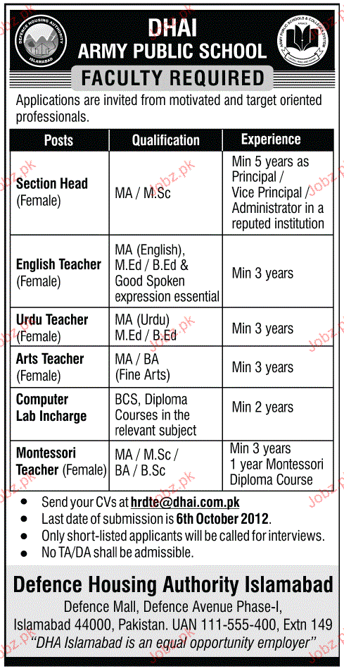 Latest Army Public School APS Teaching Posts Islamabad 2025
