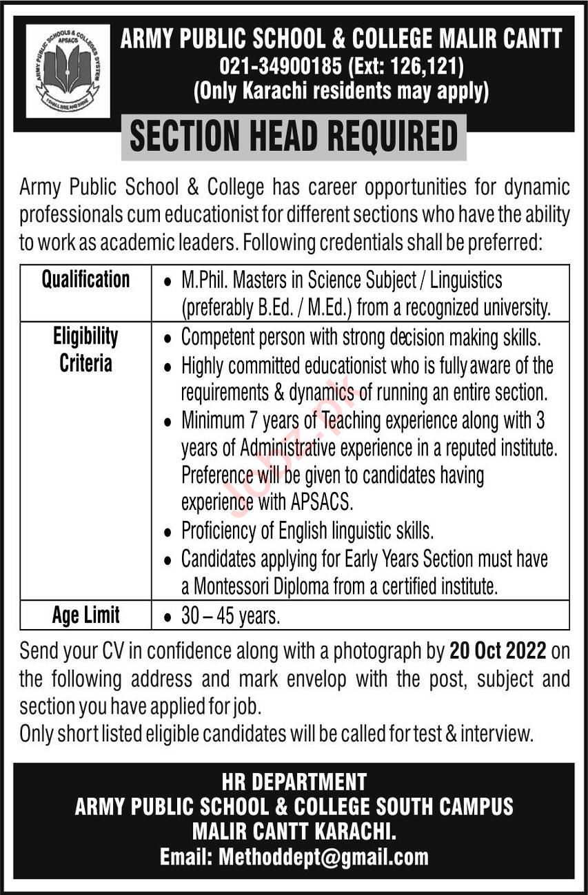 Army Public School & College invites applications for job positions advertised in daily Express dated 10 October 2022 for following vacancies in Karachi, karachi Sindh Pakistan.