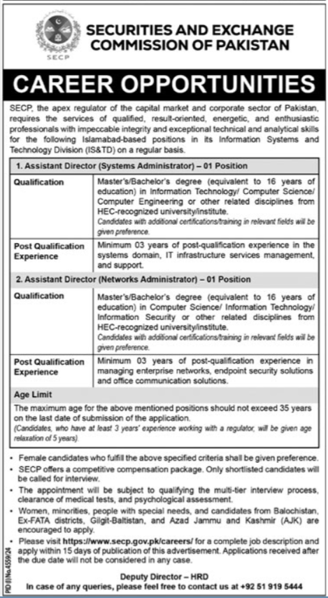 Securities & Exchange Commission of Pakistan SECP is looking for candidates for following posts as per job advertisement published in daily Ausaf Newspaper of January 10, 2025 for location Islamabad, islamabad Islamabad Pakistan:
