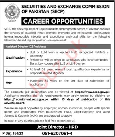 Securities and Exchange Commission of Pakistan jobs advertisement dated about 9 July 2023 in daily Jang Newspaper invites application for the vacant post of assistant director in Islamabad, islamabad Islamabad Pakistan. Preferred Education is LLM, LLb and Bachelor etc.