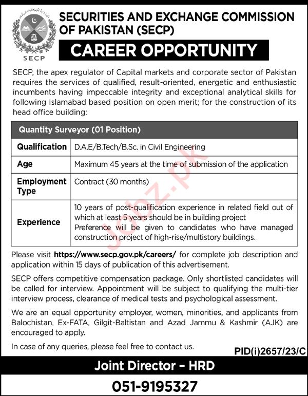 Vacant posts including qs quantity surveyor are announced in Securities & Exchange Commission of Pakistan SECP Islamabad, islamabad Islamabad Pakistan as per 5 November 2023 advertisement in daily Jang Newspaper. Candidates with Intermediate and Bachelor etc. educational background will be preferred.