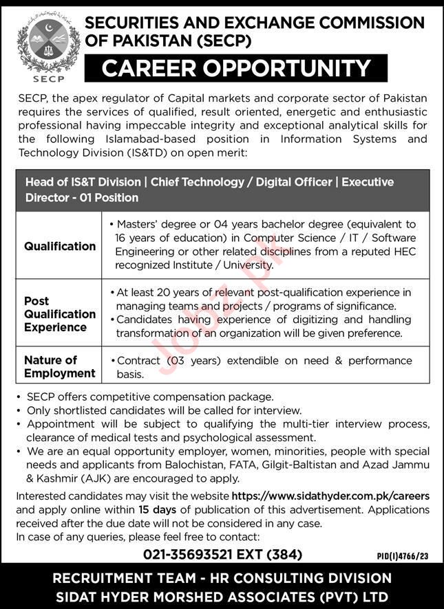 Securities & Exchange Commission of Pakistan SECP Islamabad, islamabad Islamabad Pakistan invites applications from eligible candidates for the post of head of ist division, head chief technology, executive director and digital officer as per advertisement of February 11, 2024 published in daily Express Newspaper. Educational qualifications required Bachelor, MS and Master etc.