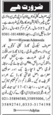 Vacant posts including security supervisor, carpenter, plumber, security guard, security checker and electrician are announced in Private Company Karachi, karachi Sindh Pakistan as per 26 August 2022 advertisement in daily Nawaiwaqt Newspaper. Educational qualifications required Bachelor, Middle, Matric and Intermediate etc.