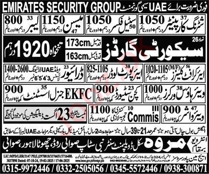 Marwa Skill Development Center jobs advertisement dated about 18 August 2025 in daily Express Newspaper invites application for the vacant post of Aircraft Cleaner, Ware Washer, Driver, Steel Fixer, Kitchen Steward, Ekfc General Assistant, Airport Loader, Mason, Labor, Security Guard, Commis, Shuttering Carpenter and Warehouse Worker in UAE, uae UAE. Persons with Primary, Middle, Matric and Intermediate etc. education can apply.