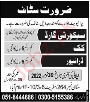 Private Company Islamabad, islamabad Islamabad Pakistan invites applications from eligible candidates for the post of driver, security guard and cook as per advertisement of November 20, 2022 published in daily Mashriq Newspaper. Candidates with Matric, Middle and Primary etc. educational background will be preferred.