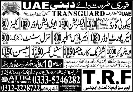 Vacant posts including aviation loader, mason, shuttering carpenter, airport loader, general assistant, security guard, cleaner, warehouse helper, electrician, waiter and steel fixer are announced in TRF Overseas Employment Agency UAE, dubai UAE as per 9 July 2023 advertisement in daily Express Newspaper. Candidates with Intermediate, Primary, Matric and Middle etc. educational background will be preferred.
