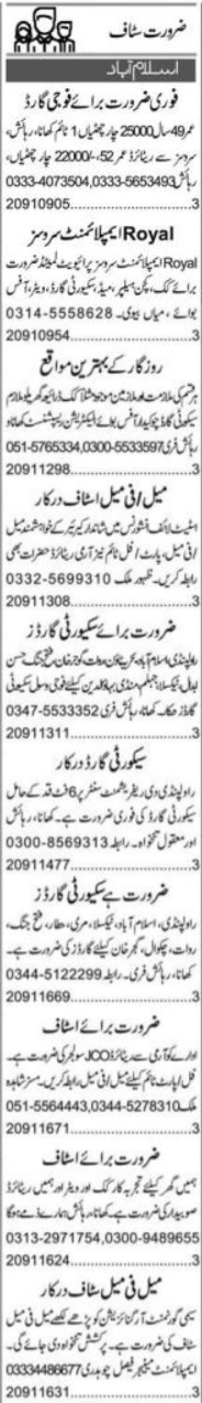 Private jobs advertisement dated about 10 October 2023 in daily Express Newspaper invites application for the vacant post of retired jco, waiter, office boy, kitchen helper, fauji guard, house maid, cook, receptionist, chowkidar, male female staff, security guard, driver, electrician, state life insurance staff and retired soldier in Islamabad, islamabad Islamabad Pakistan. Preferred Education is Primary, Bachelor, Intermediate, Middle and Matric etc.
