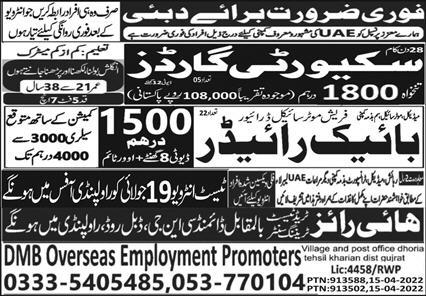 Vacant posts including bike rider and security guard are announced in DMB Overseas Employment Promoters Dubai, dubai Dubai as per 18 July 2022 advertisement in daily Express Newspaper. Candidates with Intermediate, Middle and Matric etc. educational background will be preferred.