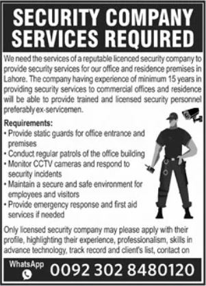 Latest Private jobs in Security Company in Security and others can be applied till 27 April 2025 or as per closing date in newspaper ad. Read complete ad online to know how to apply on latest Security Company job opportunities.