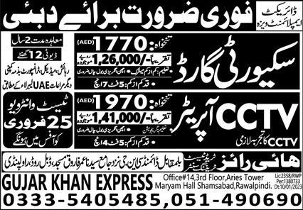 Gujar Khan Express jobs advertisement dated about 24 February 2023 in daily Express Newspaper invites application for the vacant post of cctv operator and security guard in Abu Dhabi, dubai UAE. Intermediate and Matric etc. educational qualification will be preferred.