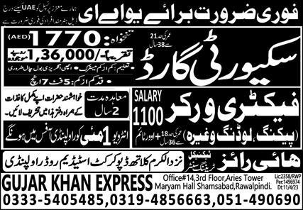 Gujar Khan Express Sharjah, abu dhabi UAE invites applications from eligible candidates for the post of security guard and factory worker as per advertisement of April 29, 2023 published in daily Express Newspaper. Preferred Education is Matric etc.