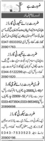 Security Company Islamabad, hassan abdal, fateh jang, gujar khan, taxila, murree, jhelum, rawalpindi, hattar, chakwal and mandi bahauddin Islamabad Pakistan invites applications from eligible candidates for the post of fauji guard, security guard, security staff and civilian guard as per advertisement of July 20, 2023 published in daily Express Newspaper. Preferred Education is Matric, Middle and Intermediate etc.