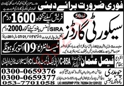 Chaudhry Recruiting Agency jobs advertisement dated about 9 October 2022 in daily Express Newspaper invites application for the vacant post of security guard in UAE, dubai UAE. Persons with Middle and Primary etc. education can apply.
