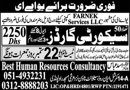 Best Human Resources Consultancy jobs advertisement dated about 16 September 2022 in daily Express Newspaper invites application for the vacant post of security guard in Sharjah, dubai UAE. Preferred Education is Matric and Intermediate etc.