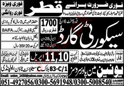 Union Manpower Services jobs advertisement dated about 9 April 2023 in daily Express Newspaper invites application for the vacant post of security guard in Qatar, qatar Qatar. Candidates with Matric, Bachelor and Intermediate etc. educational background will be preferred.