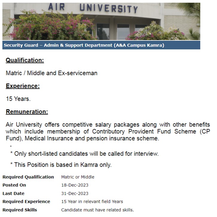 Vacant posts including security guard are announced in Air University Attock, attock Punjab Pakistan as per 23 December 2023 advertisement in daily Other Newspaper. Matric and Middle etc. educational qualification will be preferred.