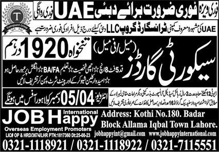 Job Happy International Overeseas Manpower Employment Promoters Abu Dhabi, dubai UAE invites applications from eligible candidates for the post of security guard as per advertisement of December 3, 2023 published in daily Express Newspaper. Preferred Education is Intermediate and Matric etc.