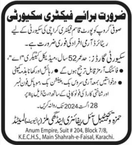 Hamza Vegetable Oil Refinery & Ghee Mills Pvt Ltd Karachi, karachi Sindh Pakistan invites applications from eligible candidates for the post of security guard as per advertisement of August 20, 2024 published in daily Jang Newspaper. Preferred Education is Middle etc.