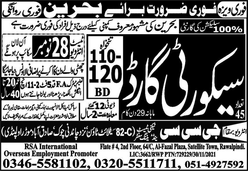 RSA International jobs advertisement dated about 25 November 2022 in daily Express Newspaper invites application for the vacant post of security guard in Bahrain, bahrain Bahrain. Intermediate and Matric etc. educational qualification will be preferred.
