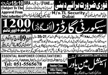 Vacant posts including security guard are announced in Essential Manpower Consultant EMC UAE, dubai UAE as per 3 March 2023 advertisement in daily Express Newspaper. Preferred Education is Intermediate and Matric etc.