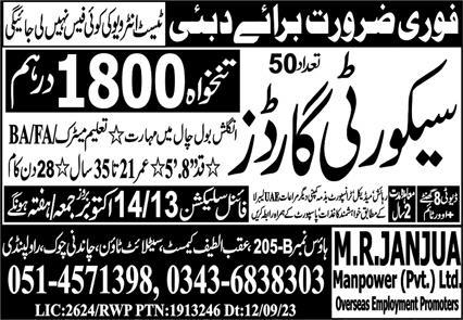 Latest Security jobs and others Overseas jobs in MR Janjua Manpower Pvt Limited closing date is around October 14, 2023, see exact from ad. Read complete ad online to know how to apply on latest MR Janjua Manpower Pvt Limited job opportunities.