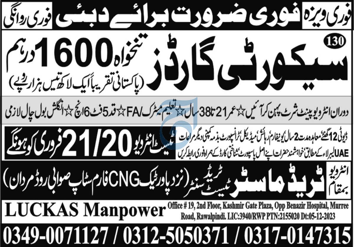 Luckas Manpower Dubai, dubai Dubai invites applications from eligible candidates for the post of securtity guard as per advertisement of February 15, 2024 published in daily Aaj Newspaper. Persons with Intermediate, Bachelor and Matric etc. education can apply.