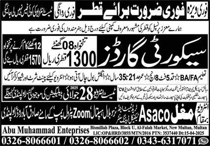 Abu Muhammad Enterprises Company Overseas Employment Promoters jobs advertisement dated about 28 July 2025 in daily Express Newspaper invites application for the vacant post of security guard in Qatar, qatar Qatar. Candidates with Bachelor, BA and Intermediate etc. educational background will be preferred.