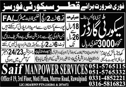 Saif Manpower Services Qatar, qatar Qatar invites applications from eligible candidates for the post of security guard as per advertisement of December 22, 2023 published in daily Express Newspaper. Intermediate and Matric etc. educational qualification will be preferred.