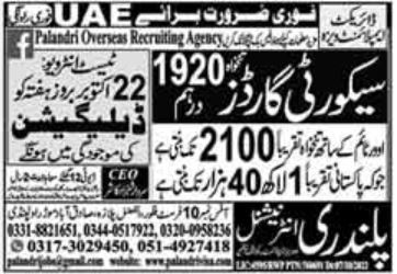 Palandri International Overseas Recruiting Agency is looking for candidates for following posts as per job advertisement published in daily Dunya Newspaper of October 13, 2022 for location UAE, uae UAE: