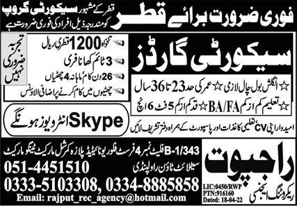 Rajpoot Recruitment Agency is looking for candidates for following posts as per job advertisement published in daily Express Newspaper of April 20, 2022 for location Qatar, qatar Qatar: