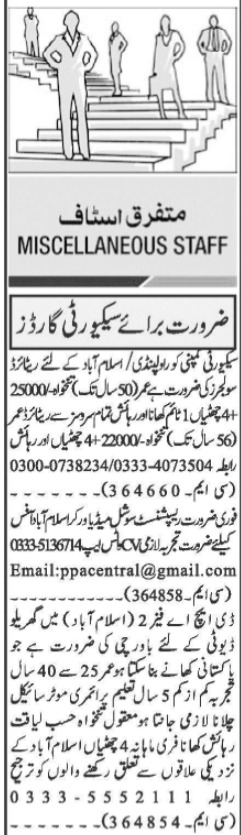 Security Guard Receptionist & Cook Jobs 2023 in Islamabad