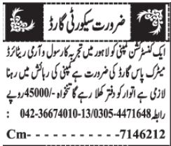 Construction Company is looking for candidates for following posts as per job advertisement published in daily Jang Newspaper of May 21, 2024 for location Lahore, lahore Punjab Pakistan: