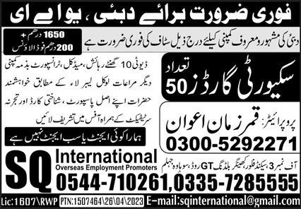 SQ International Agency jobs advertisement dated about 24 May 2023 in daily Express Newspaper invites application for the vacant post of security guard in UAE, dubai UAE. Middle etc. educational qualification will be preferred.