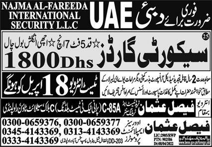Vacant posts including security officer, security guard and security staff are announced in Faisal Usman Overseas Employment Promoters Dubai, dubai Dubai as per 15 April 2022 advertisement in daily Express Newspaper. Preferred Education is Matric and Intermediate etc.