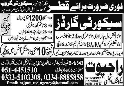Rajput Recruiting Agency is looking for candidates for following posts as per job advertisement published in daily Express Newspaper of May 7, 2022 for location Qatar: