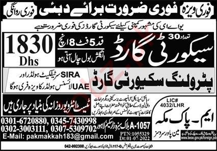 Vacant posts including security guard and security staff are announced in M Pak Makkah Manpower Services Dubai, dubai Dubai as per 29 July 2022 advertisement in daily Express Newspaper. Persons with Matric and Intermediate etc. education can apply.