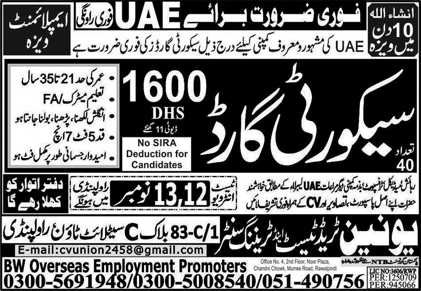 BW Overseas Employment Promoters is looking for candidates for following posts as per job advertisement published in daily Express Newspaper of November 11, 2022 for location Abu Dhabi, sharjah UAE: