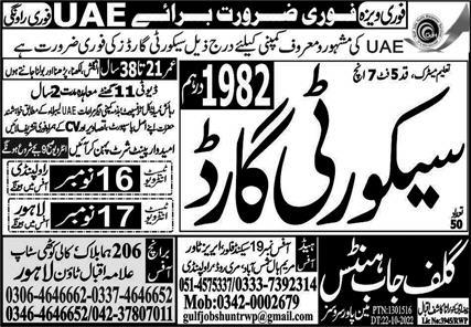 Vacant posts including security guard and security staff are announced in Gulf Job Hunts Manpower Services Abu Dhabi, dubai UAE as per 15 November 2022 advertisement in daily Express Newspaper. Preferred Education is Intermediate and Matric etc.