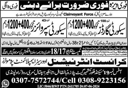Vacant posts including security supervisor and security guard are announced in Christ International Overseas Employment Promoters Dubai, abu dhabi Dubai as per 17 January 2025 advertisement in daily Express Newspaper. Candidates with Matric and Intermediate etc. educational background will be preferred.
