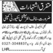 Security Company invites applications for job positions advertised in daily Khabrain dated 11 January 2024 for following vacancies in Lahore, lahore Punjab Pakistan.