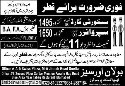 Bolan Overseas Employment Promoters Qatar, Qatar invites applications from eligible candidates for the post of supervisor and security guard as per advertisement of May 10, 2022 published in daily Express Newspaper. Candidates with Bachelor and Intermediate etc. educational background will be preferred.