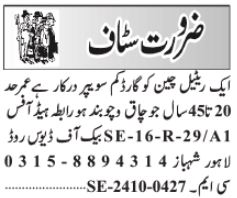 Retail Chain is looking for candidates for following posts as per job advertisement published in daily Jang Newspaper of October 12, 2024 for location Lahore, lahore Punjab Pakistan: