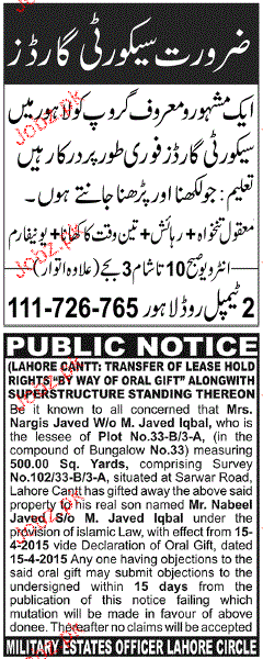 Latest Private Company Security Posts Lahore 2025