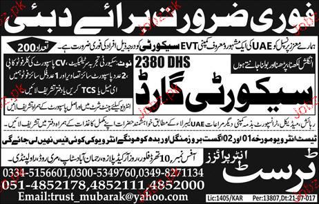 Our Respected Principal require the service of Security Guards in UAE Famous Company EVT in Dubai. Food, Medical and Residence will be provided by the Company.