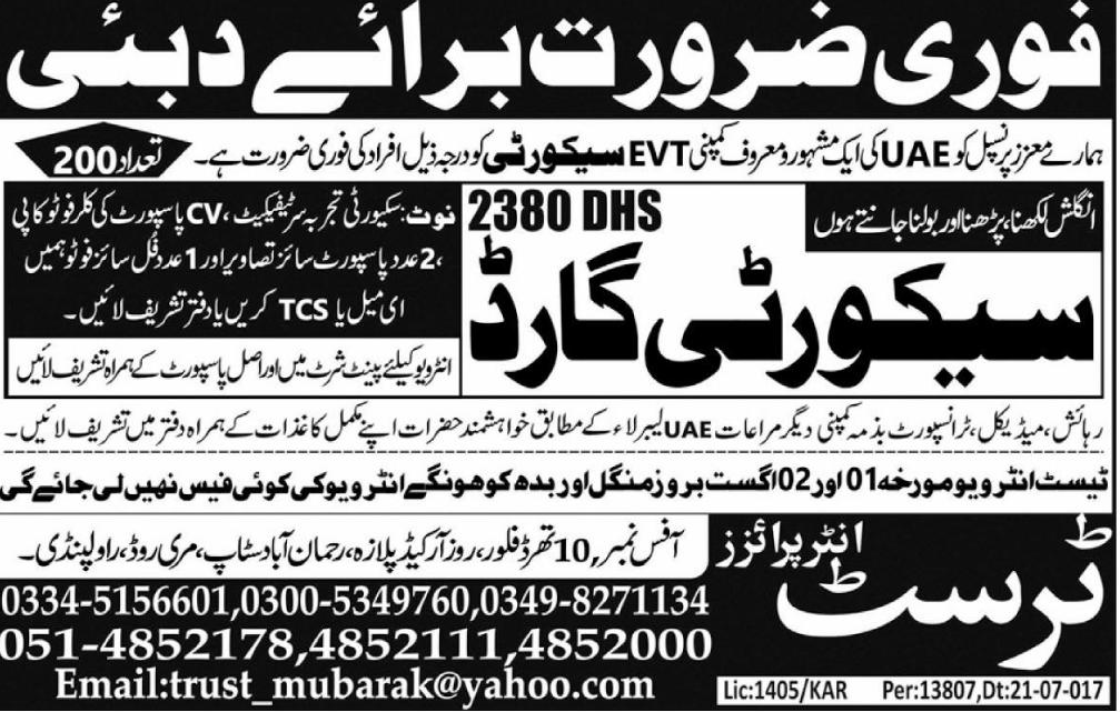 Our Respected Principal require the service of Security Guards in Famous Company EVT in Dubai. Qualified and Experienced Candidate Send their CV Along with All necessary Documents.